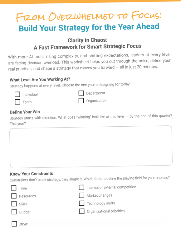 2026 strategy worksheet, strategic planning worksheet, clarity tool for leaders, personal strategy framework, leadership planning worksheet, team strategy planner, 20-minute strategy exercise Clarity in Chaos: A Fast Framework for Smart Strategic Focus Dec 4, 2025 12:25:36 PM Download Now
